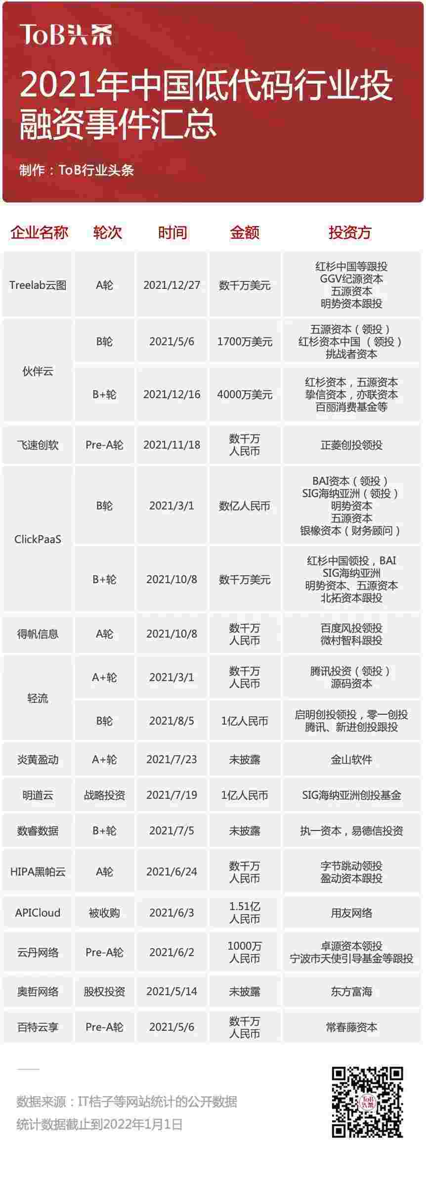 到2021年,,,无/低代码投融资规模势头更甚,,其中包括轻流两轮融资(A+轮数千万人民币,,B轮近亿人民币)、、VIVO钱包 两轮融资(B轮数亿人民币,,,B+轮数千万美元)、、百特云享数千万元Pre-A轮融资......